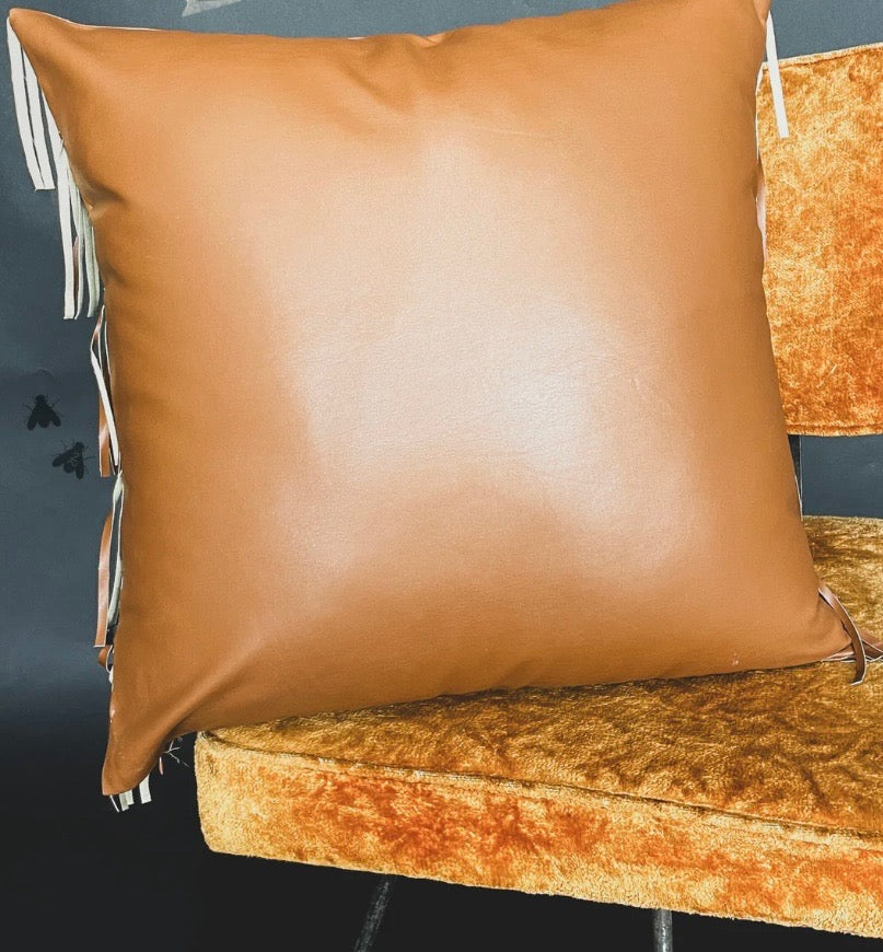 Faux Leather Fully Fringed Pillow Case. it's perfect to add to your pillow collection. Zip closure for inserting DIMENSIONS: 19.5" X 19.5"